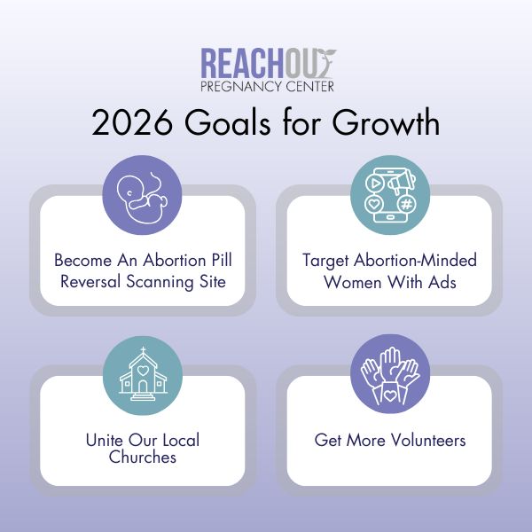 At Reach Out Pregnancy Center (ROPC), we walk alongside women and men in our local community facing unexpected pregnancies or financial hardship. Thanks to our volunteers, generous donors, and staff, we’re able to offer free pregnancy tests, ultrasounds, and parenting classes—all at no cost to the families we serve. In 2025, we served 172 clients, more than any given year prior, and celebrated the birth of 35 babies!